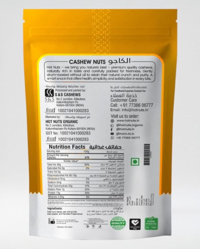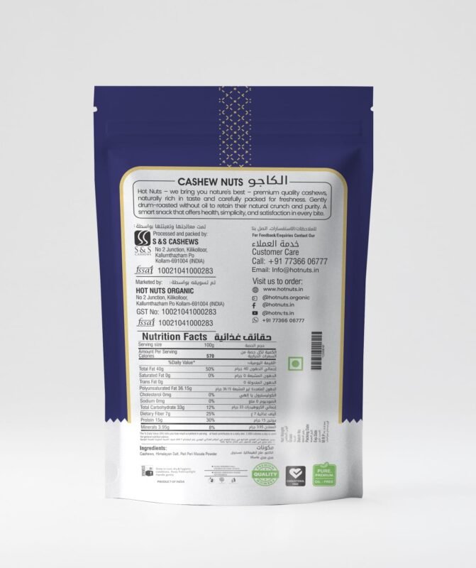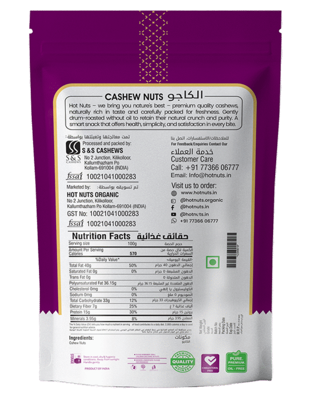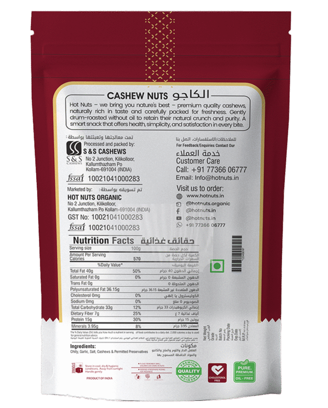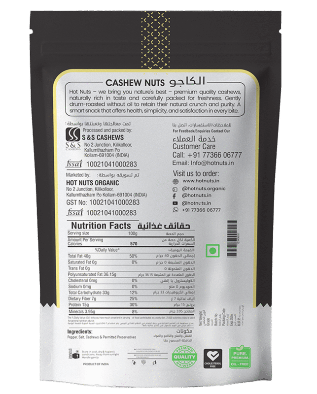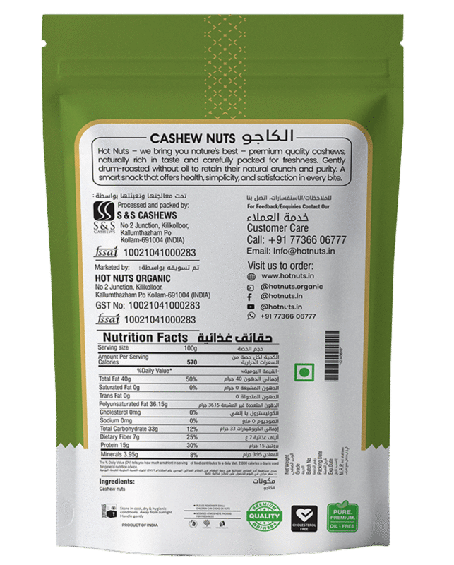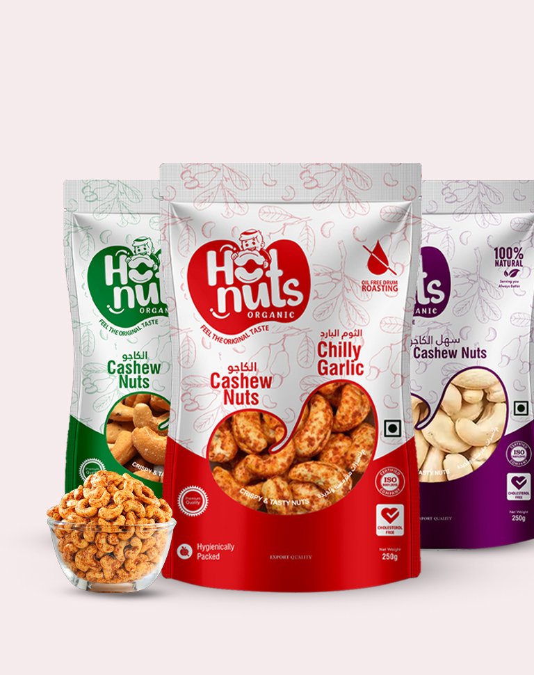 At Hotnuts, we take pride in delivering premium organic cashews that are fresh, crunchy, and naturally nutritious. Sourced and meticulously manufactured by S&S Cashews, our cashews undergo careful processing to retain their purity, flavor, and health benefits. Every cashew is thoughtfully selected and crafted to provide a wholesome snacking experience, combining taste, energy, and wellness in every bite. Once prepared, these high-quality cashews are packed and presented under our Hotnuts brand, ensuring you receive a product that reflects our commitment to quality, authenticity, and nutritional excellence. Hotnuts isn’t just a snack—it’s a promise of health, freshness, and premium indulgence.