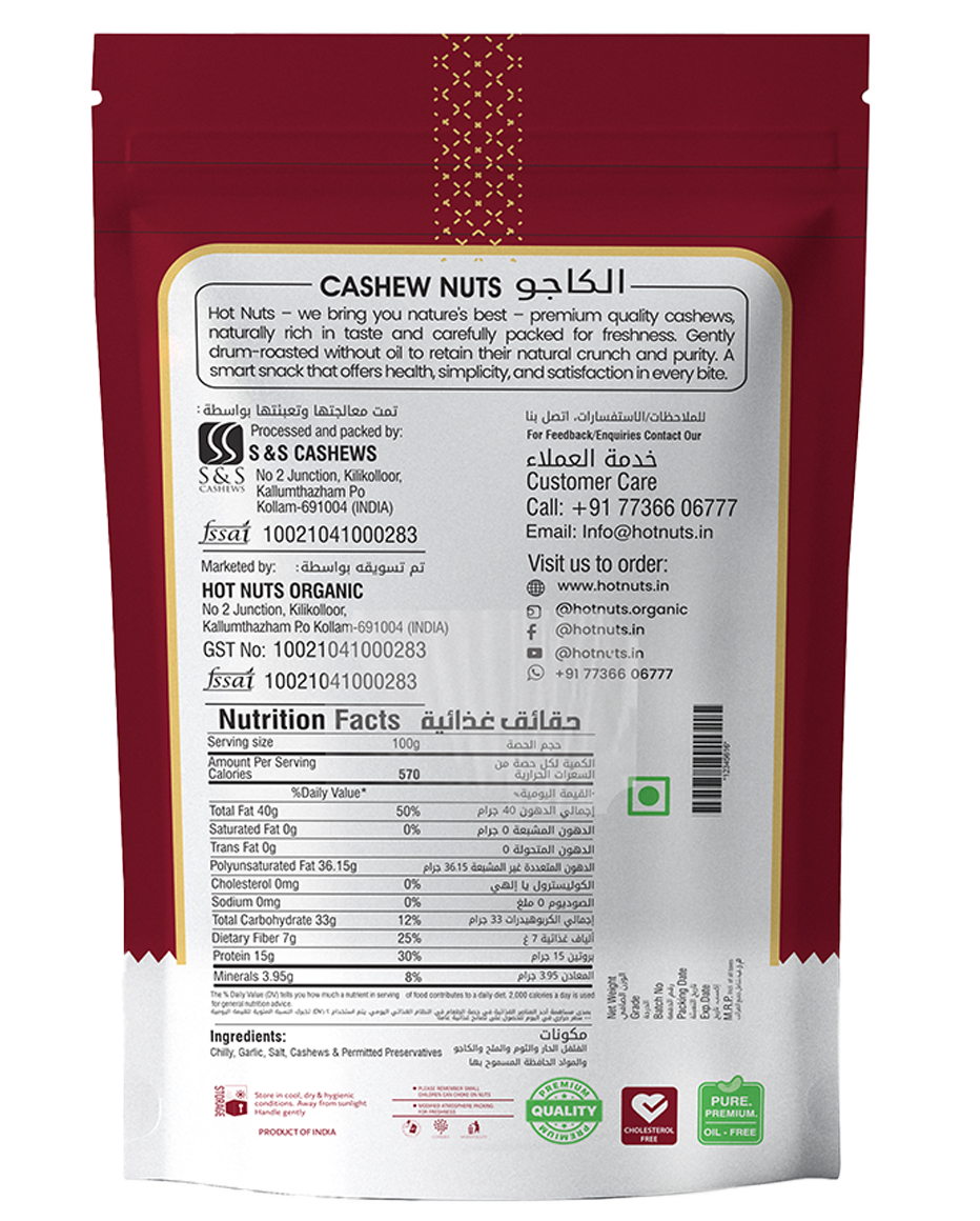 Our Chilli Garlic Roasted Cashews are a wholesome, protein-rich snack made with premium nuts, roasted—not fried—and seasoned with natural chilli and garlic for a flavourful yet healthy bite. Perfect for guilt-free snacking.